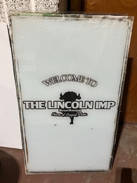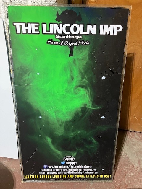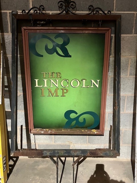 Take a look below at some pictures of the signage to bid on. We have one of the green imp signs and two of the The Lincoln Imp signs.